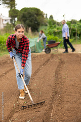 Girl works in village garden, uses rake to cultivate plantation, aligns soil surface and prepares beds for planting seeds