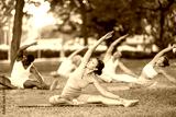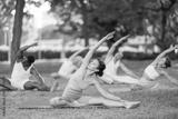 Multinational people of different ages in park practicing yoga. Amateurs performing gymnastic. Woman yoga master and followers do Janu Shirshasana. People practice sports during in nature