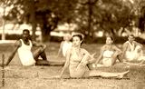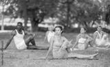 Various yoga poses performed by group of multinational people in the fresh air in the summer garden