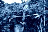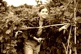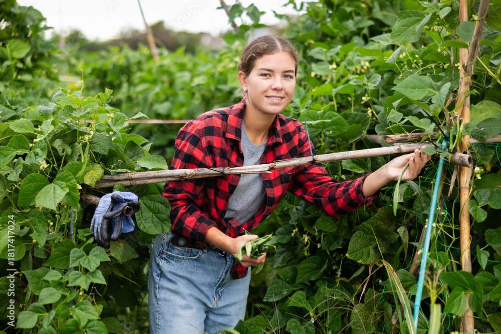 Concept of active hobby, cultivation and gardening in rural area. Young woman is working in garden between beds, picking ripe beans from branches, and holding lot of fruits in hands.