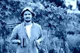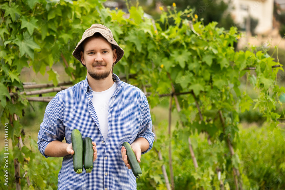 Portrait of happy man with harvest of cucumbers in her hands in a field
