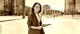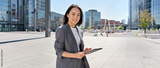 Young happy Asian business woman entrepreneur wearing suit holding digital tablet standing in big city on busy street, using smart business software tech for online work on pad computer outdoor