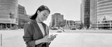 Young happy Asian business woman wearing suit holding mobile phone standing in big city on busy downtown street, smiling lady using smartphone for texting, using apps outside