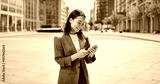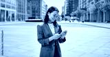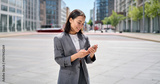 Young happy Asian business woman wearing suit holding mobile phone standing in big city on busy street, smiling lady worker using smartphone for texting, cellphone apps for work outside, vertical