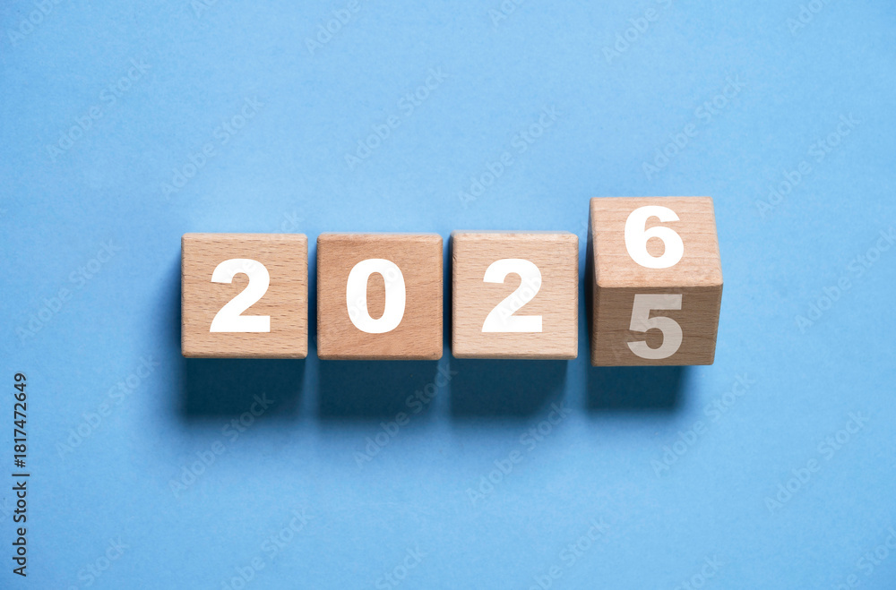 Wooden block flipping from 2025 to 2026 symbolizing beginnings future planning goal setting progress and business development for merry Christmas and happy new year preparation concept.