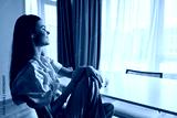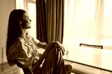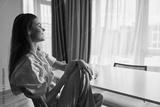 Woman relaxation home sunlight window smile chair portrait of a young woman seated at a table, enjoying morning light and calm mood in a cozy apartment interior with soft curtains.