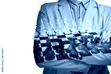 Double Exposure of Businessman in Suit with Chess on Chessboard