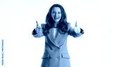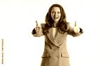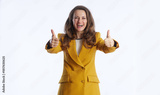 A smiling businesswoman in mustard yellow blazer gives double thumbs-up gesture, radiating positivity and approval. Against plain white background, she embodies confidence, success and agreement