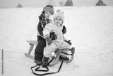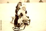 Brother and sister sitting on wooden sled during cold winter day.