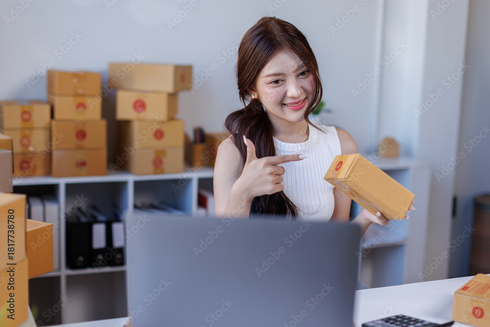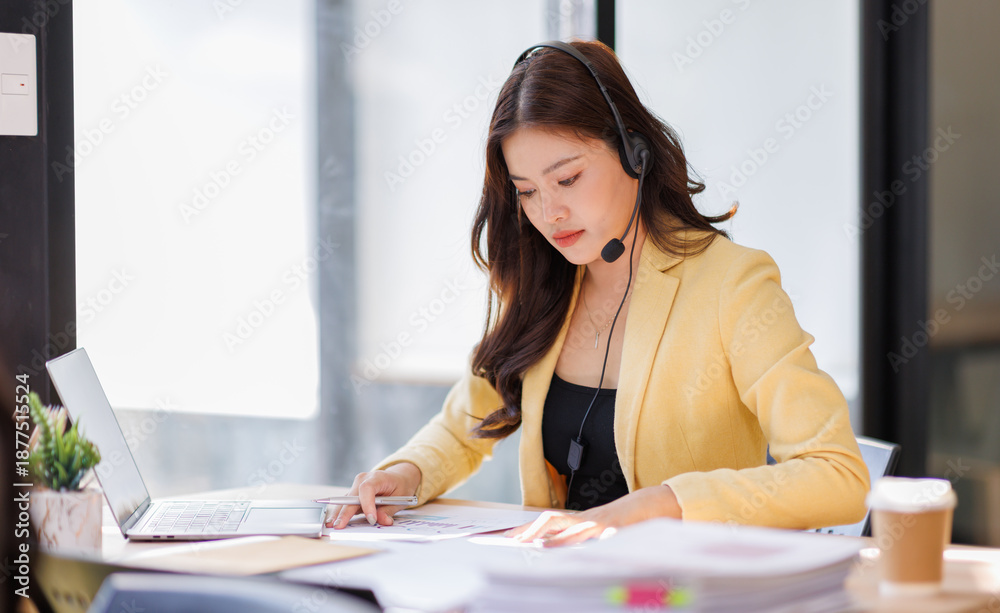 Business woman Asian accountant smiles while analyzing financial data on her laptop and using a calculator in a bright office setting