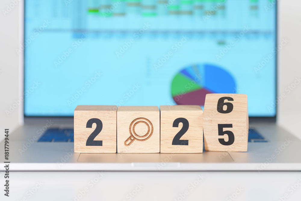 2025 end year to Happy New Year 2026 block with magnifying glass icon against laptop computer. SEO, Search Engine Optimization, hiring , Advertising, Strategy, marketing, Keyword, Content and New year
