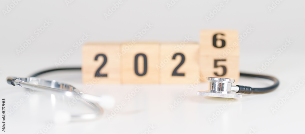 2025 end year to Happy New Year 2026 with Stethoscope of doctor and heart shape on table. health care, Insurance, Wellness and medical concepts