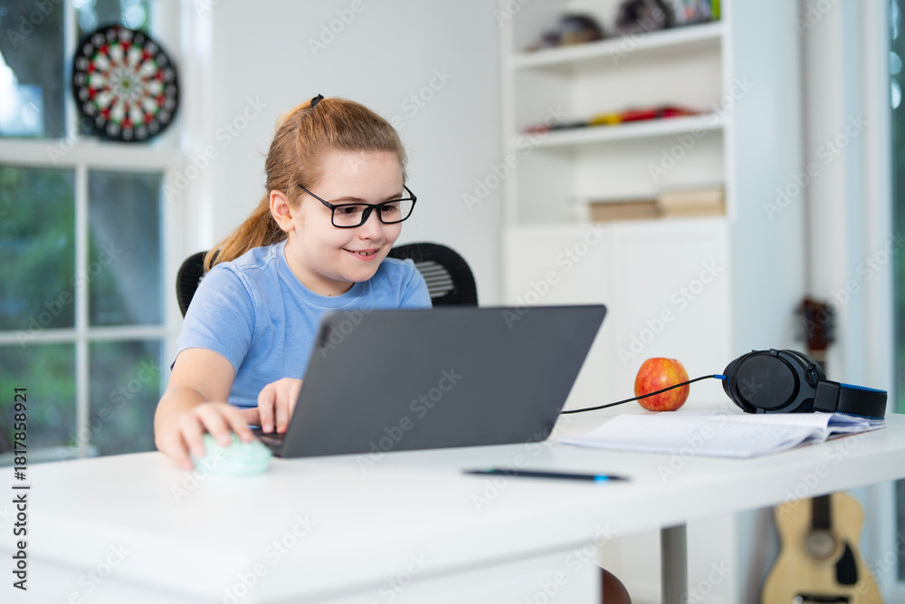 Kid preparing for exam with laptop. Student sitting at desk during distance education class. Smart child in virtual schoolwork and study. Child learning mathematics on laptop in home classroom.