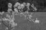 Watering can and shovel on green grass. Spring planting tools. Garden tools on grass. Shovel and fruit tree in garden. Spring gardening tools.