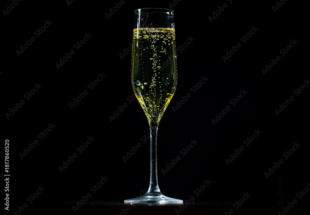 Champagne sparkling in a crystal glass. Pouring bubbly champagne with festive bubbles. Close-up of sparkling wine splash in elegant wineglass.