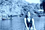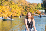 Closeup of one happy young woman in Central Park in New York City nyc by The Lake during sunny autumn day with people rowing on romantic boats, gondolas in water