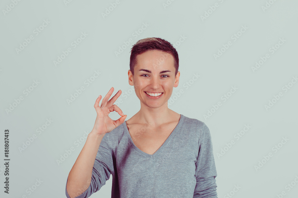 Portrait beautiful happy young woman showing Ok sign with hand isolated on light green gray wall background. Positive human emotions face expression body language