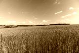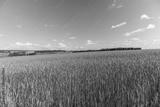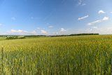 A Vibrant Wheat Field Expansively Spread Under a Clear and Beautiful Blue Sky Above