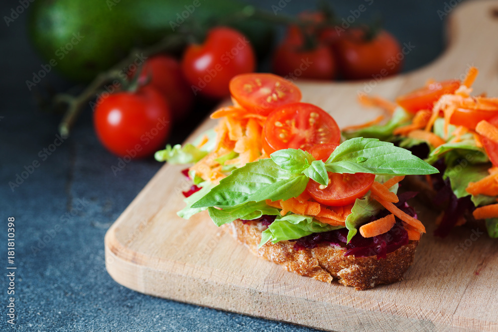 Healthy sandwich made of a fresh ciabbata with fresh vegan ingredients