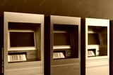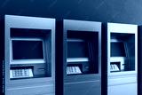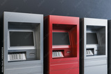 Row of modern ATM machines in red and gray colors against dark wall background in clean, minimalistic setting. 3D Rendering. 3D Rendering