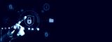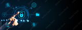 Cybersecurity protection interface with glowing lock hologram and digital icons for secure data access on dark background with neon blue light.