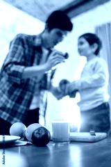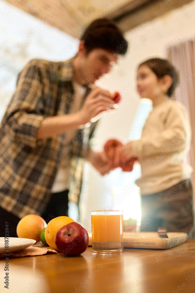 Fresh orange juice in glass with blurred father and little boy fruit prep in warm kitchen. Concept of drink advertising, cozy lifestyle visuals and healthy morning mood.