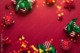 Merry Christmas and Happy Holidays greeting card, frame, banner. New Year. Red Christmas ornaments and gifts, presents on red background top view. Xmas holiday festive theme. Christmas decoration