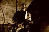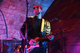 Handsome man playing electric guitar on stage, low angle view