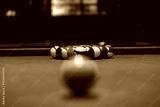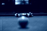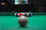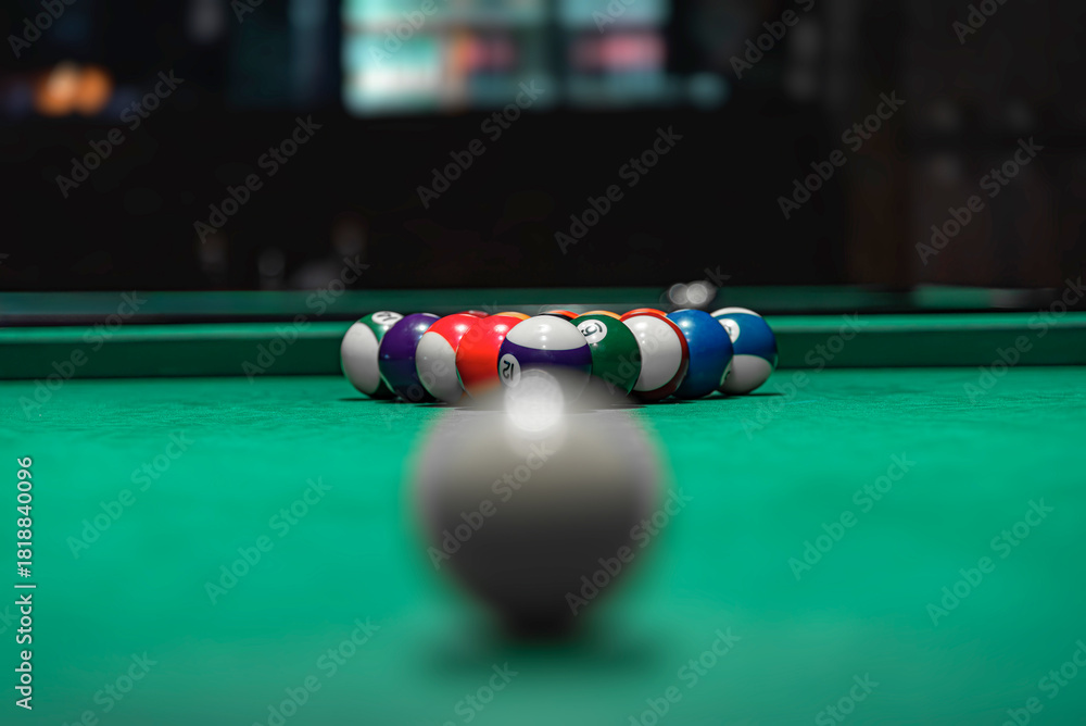 A single, white cue ball rests on a vibrant green pool table felt in a dimly lit setting, with a rack of colored billiard balls blurred in the background.