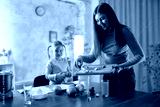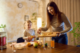 Mother and daughter preparing smoothie ingredients with orange juice beside blending container in warm kitchen. Concept of beverage creation, healthy nutrition, lifestyle and cheerful emotion.
