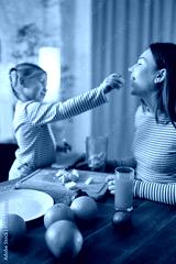 Orange juice on table while daughter feeds fruit to smiling mother in warm playful mood. Concept of drink marketing, family lifestyle visuals and emotional healthy routine.