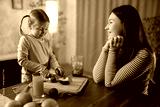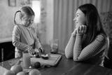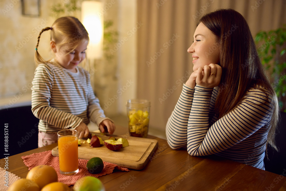 Orange juice on table while daughter cuts fruit and mother watches with warm smile. Concept of healthy drink visuals, cozy family lifestyle and emotional wellness storytelling.