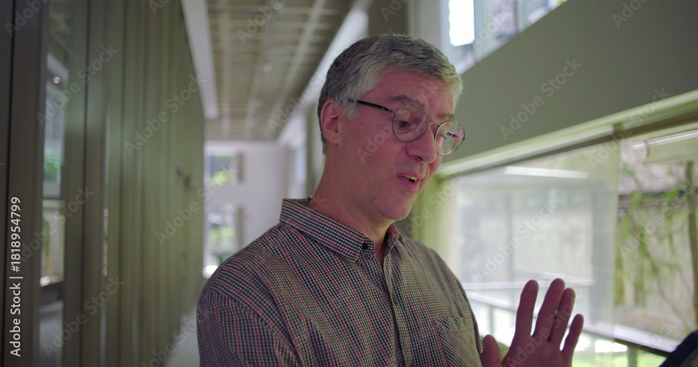 Close up of middle aged man holding cellphone during video call in office hallway engaging in remote communication using mobile device in modern work setting