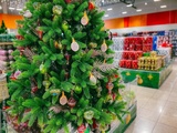 Festive Holiday Display Featuring a Beautifully Decorated Christmas Tree Surrounded by Colorful Ornaments and Cheerful Seasonal Decorations in a Store Setting