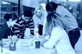 Diverse startup team actively collaborating and drawing on techn