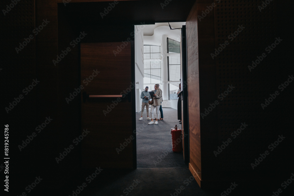 Business people stands in a sunlit gallery, discussing documents and ideas. The bright interior contrasts with a dark hallway, suggesting collaboration, learning, and a casual business gathering.