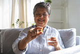 Dietary supplement health care concept, happy smile asian senior woman hand holding fish oil pills, drug tablet, take medicine with glass of water, aged take vitamin for treatment body strong at home.