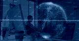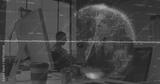 Holding pencil, woman in magenta sweater working at desk in open office with holographic globe
