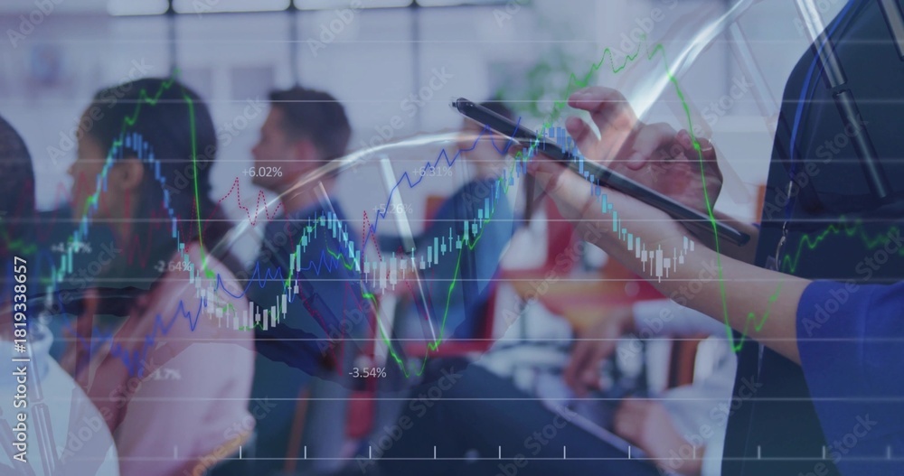 Holding tablet and stylus, woman in blue sleeves analyzing financial charts at seminar, copy space