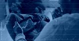 Holding tablet, man wearing light sweatshirt, jeans checking overlaying market charts on home sofa