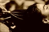 A client receives a professional hair wash at a salon, as a stylist uses a wide whisk-like comb to gently cleanse the hair in a calm, relaxing setting.