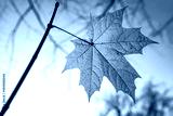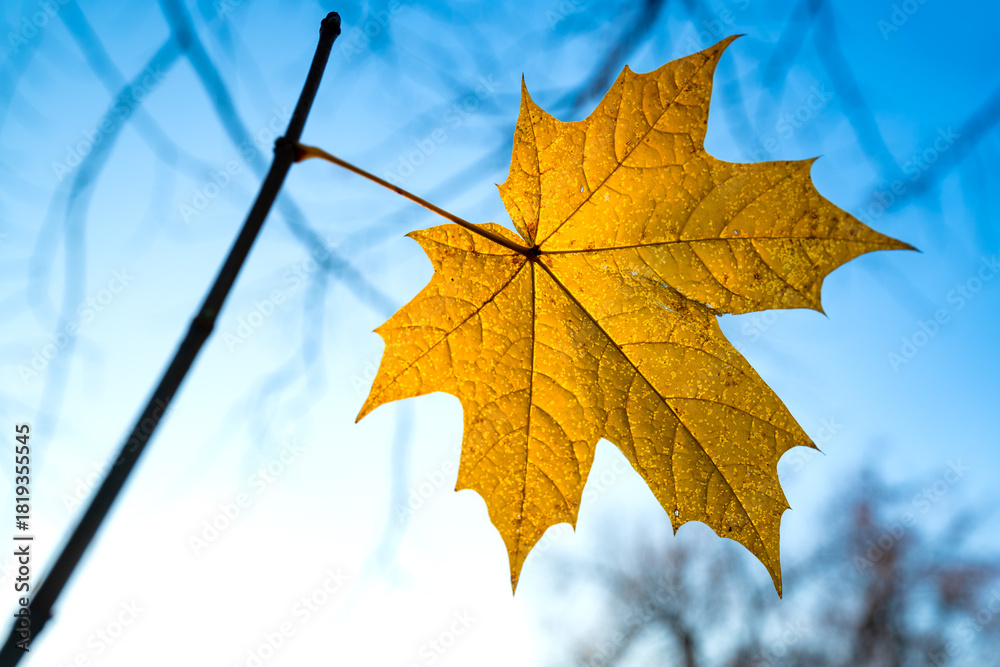 A single bright yellow maple leaf with typical shape hangs from a branch, illuminated by the radiant sun on a November morning with blue. Colorful translucent autumn foliage in a German forest.