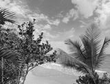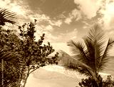 View of a tropical beach through palm leaves