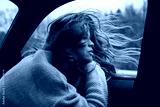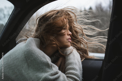 amazing cute girl looking out from car window, thinking
