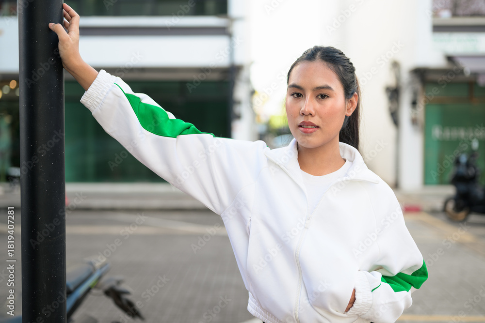 Young Asian Woman in Sporty Casual Outfit Outdoors Posing