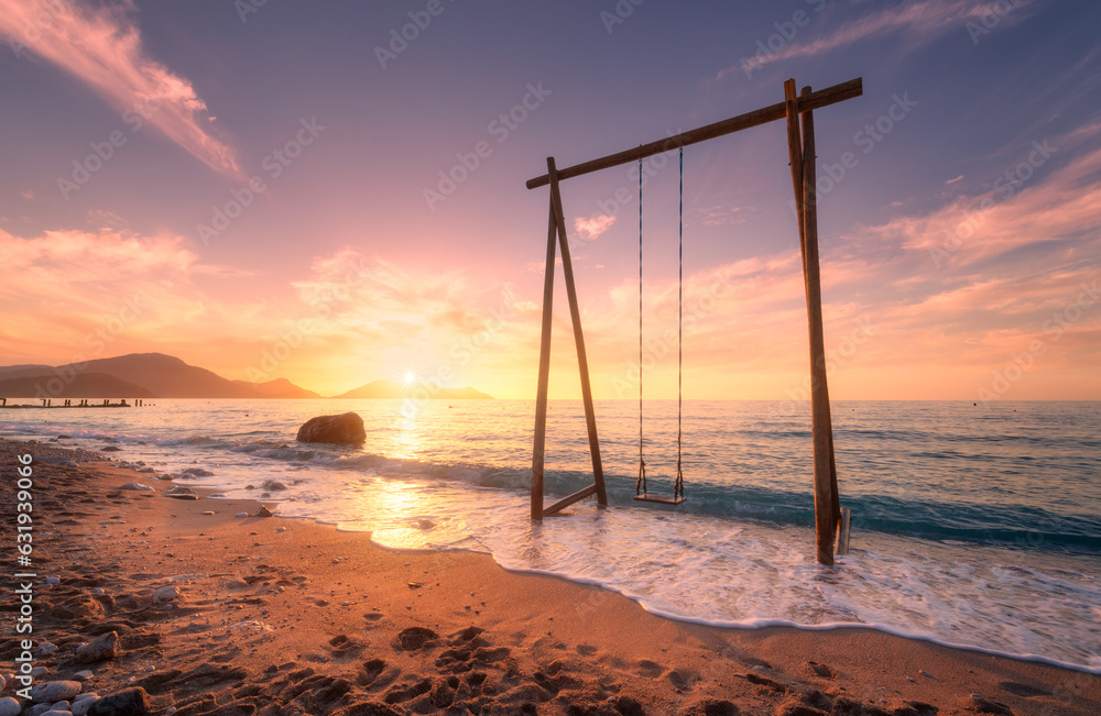Rocky winter coastline with orange seaweed on dark stones, waves hitting the shore and a snow-covered mountain. Arctic landscape with rocks, stones, sea, dramatic cloudy sky. Lofoten Islands, Norway