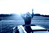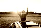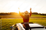 A joyful woman leans out of a car window on a sunny day at sunset. A young woman in a hat enjoys nature and feels the freedom of a road trip. Concept of adventure and relaxation.