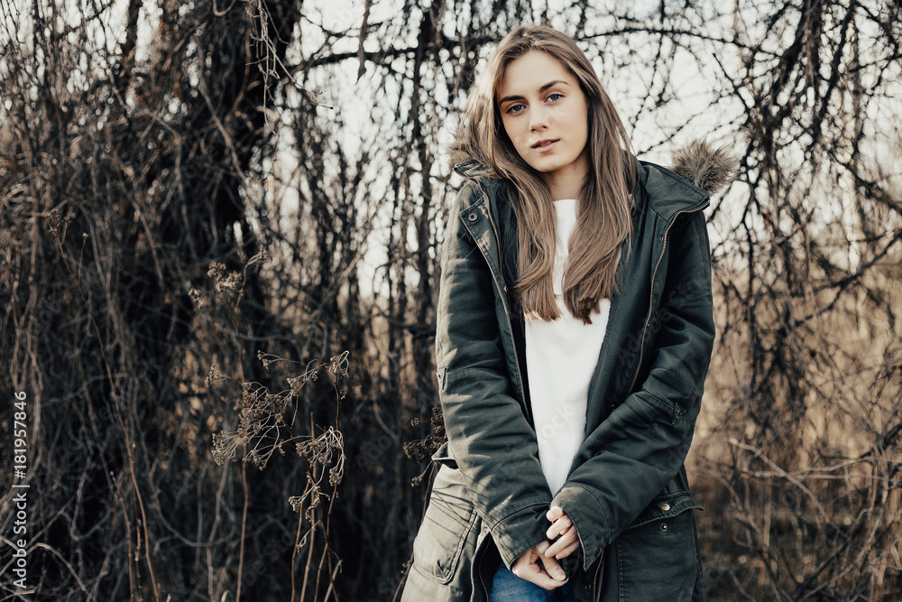 Pretty and young Woman with wide open mouth and raising eyebrow looking at camera. Girl posing at camera in park. Outdoor.