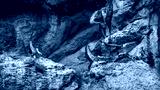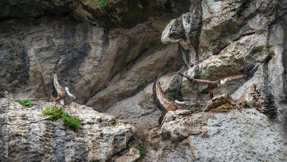 Three Eurasian Griffon Vultures (Gyps Fulvus) Perching In A Cave In The Cliffs Of Gorges Du Tarn