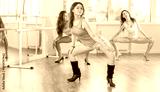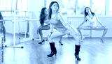 Young female dancer in casual sportswear balancing grace and femininity while practicing jazz-funk dance moves in high heels in well-lit studio with group of women..